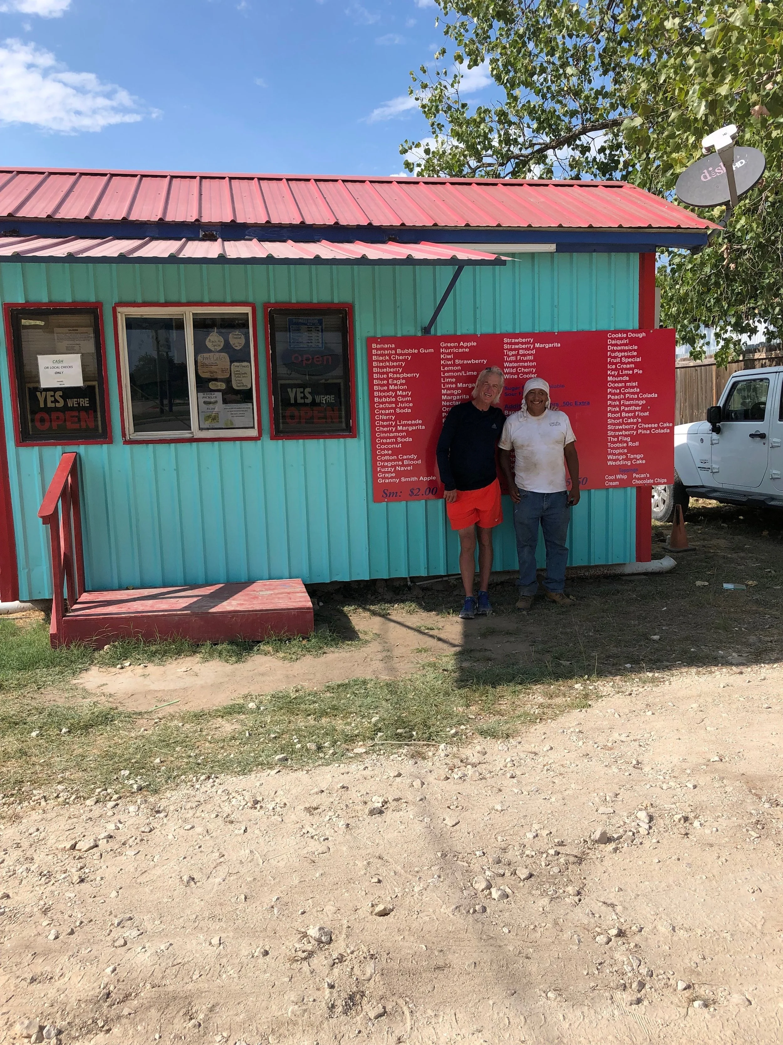 Pedro was loading his riding motor on a trailer when I arrived, and I was really really hoping he was going my way. We small talked a little about his newly purchased mower, my walk, he couldn’t believe I was from Mexico, and I asked him for a ride into town, 2 or so miles to the hotel. He of course said yes, but instead of going directly to the hotel, we stopped at Helen’s Sno Cones! I haven’t had a sno-cone in years, but much to my surprise, the had pickle juice sno-cones!! And for a bit more, chopped pickles! So for those that may not know, pickle juice is really good for cramping muscles, and exactly what this old body needed. And thanks to the pretty young lady that put my phone next to the freezer so it could regain its senses - came back in about 10 minutes. So Pedro and I sat at a picnic table outside Helen’s for quite a while, talking, and he told me about his walk.
