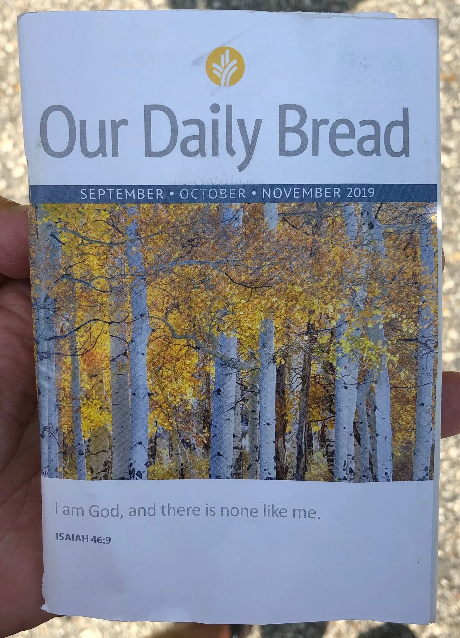 Cool think happened about an hour into the day. A gentleman slowed down, I figured he was going to offer me a ride. Instead, he handed me a copy of Our Daily Bread. My mom used to read a similar little book called Daily Word, subscriptions of which she gave many of her friends for Christmas. This gentleman told me it was his ministry, in honor if his deceased mother, and for him, and his mom, I will keep with me, and read. Quite appropriate that it is for September, October and November, 2019.